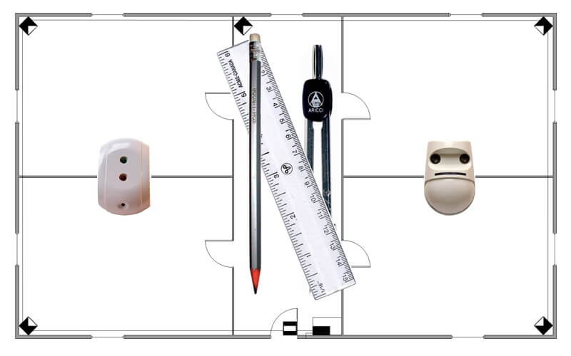 При составлении плана различают датчики для защиты внешнего периметра и внутреннего пространства. Первые реагируют на разбитые стекла, взломанные двери, поврежденные проемы, стены, полы или потолки. Вторые – настроены на движущиеся объекты в помещении.